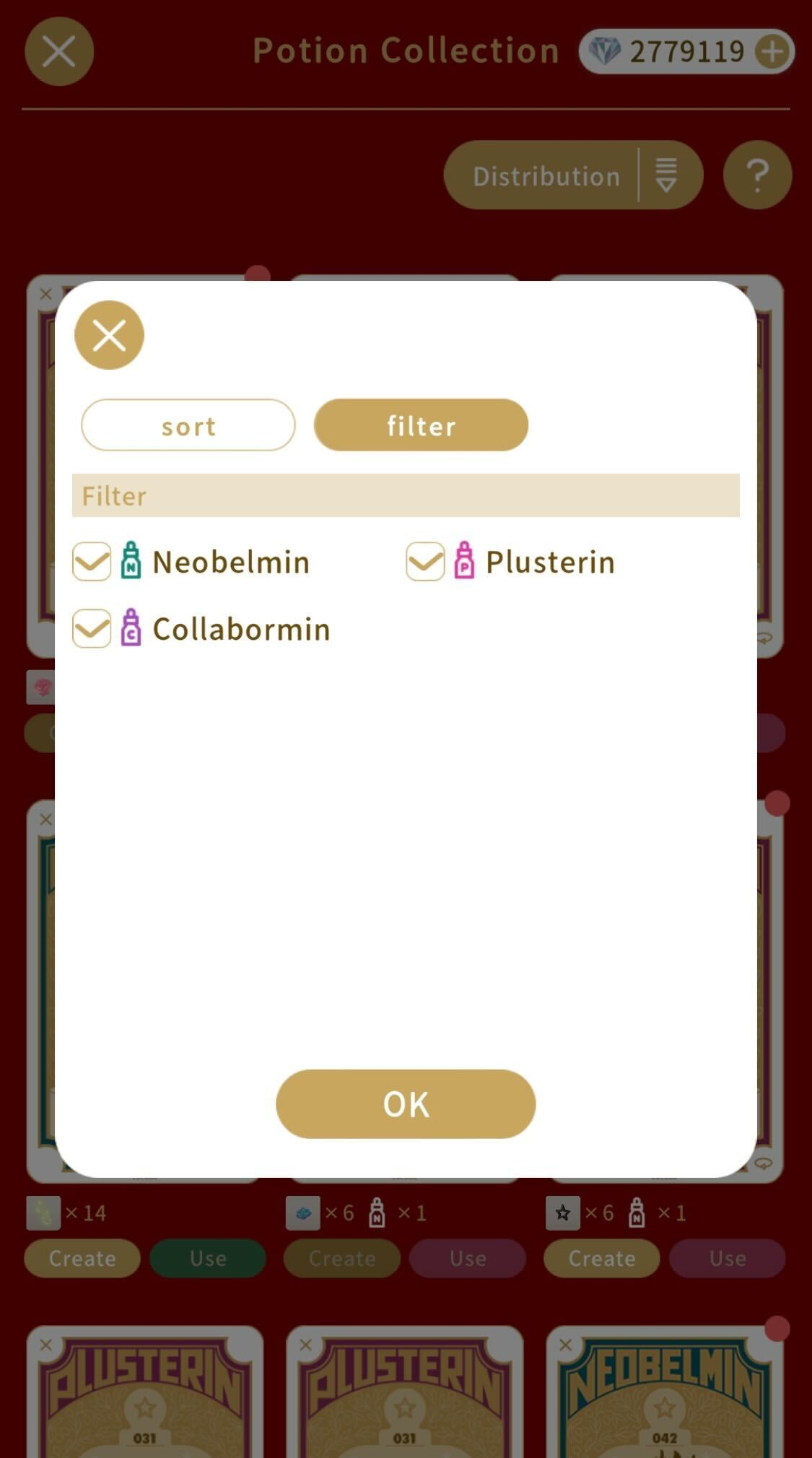 【변신약 콜렉션】에서 만들고 싶은 변신약이 안 보일 때는, 필터 기능 때문에 숨겨진 경우일 수 있어요.